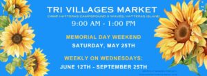 Tri-Villages Market will happen on Saturday, May 25th on Memorial Day weekend 9am-1pm. And every Wednesday 9am – 1pm starting on Wednesday, June 12th thru September 25th. All are welcome to stop by and shop! Rodanthe, Waves and Salvo are the Tri Villages and our Tri Villages Market is located at Camp Hatteras Campground. Rain or Shine.