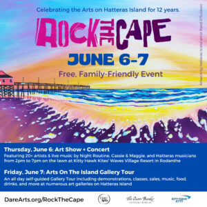 Celebrate the visual and performing arts on Hatteras Island June 6-7 with an art show, concert, and gallery tour during the 12th Annual Rock The Cape. The free, family-friendly event will begin on Thursday, June 6 with a full afternoon of art and live music from 2pm to 7pm on the lawn at Kitty Hawk Kites’ Waves Village Resort in Rodanthe.